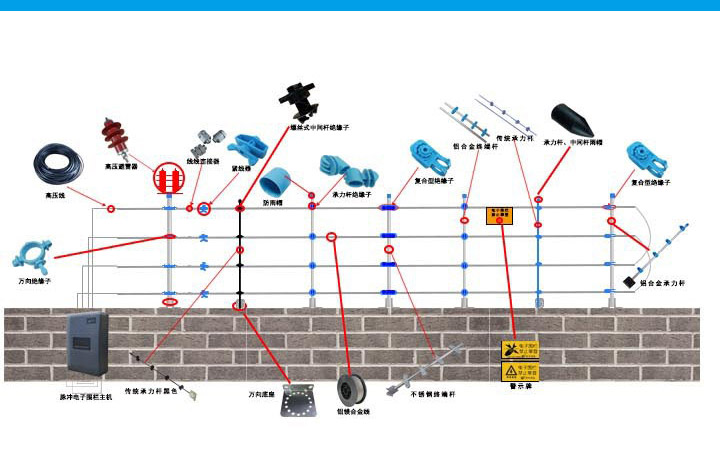 這是一個(gè)圍欄的系統(tǒng)圖,電子圍欄的使用壽命與維修率大部分是有圍欄前端決定的,那么什么樣的圍欄配件是我們自己所需要的,是價(jià)格便宜容易腐蝕損壞的立柱還是耐久度更好的立柱。